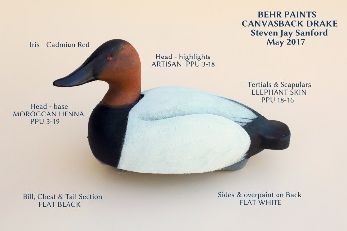 Here are the paints I use – Behr sample jars from Home Depot. For both sexes I put in some subtleties and details that are not necessary for gunning stool. The Drakes, for example, could be completed with just Flat Black, Flat White and a rusty red (Moroccan Henna or Artisan) and still draw plenty of Canvasbacks within range.