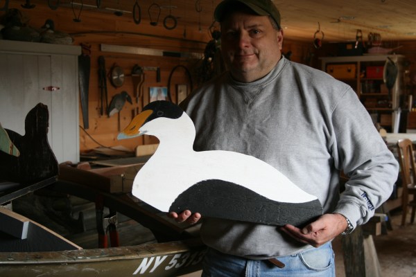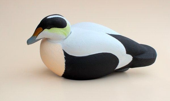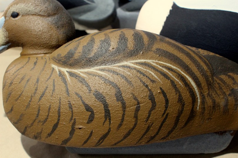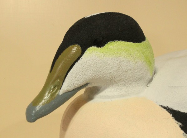 The year 2016 finally brought some Eider stool into my shop. Another friend wanted help painting the heads on some silhouettes he was making as a gift for another Eider guide. We re-painted a nice big plywood silhouette – and replicated the existing, elegantly simple paint pattern on the body.