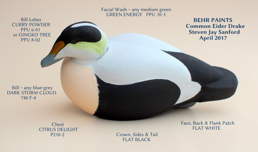 Here are the Behr latex paints I use – mostly in 8-ounce sample-size jars – for the Drake. You can easily mix the Blue-Grey bill color simply by adding a bit of Flat Black to some Flat White. Also, the green wash on the cheeks on this bird is a bit too bright and too yellowish. The Green Energy listed here is a better choice, more of a medium green. Finally, note that I give two choices for the lobes on the bill. I use the Curry Powder for Drake Black Duck bills and the Gingko Tree for Hen Black Duck bills.